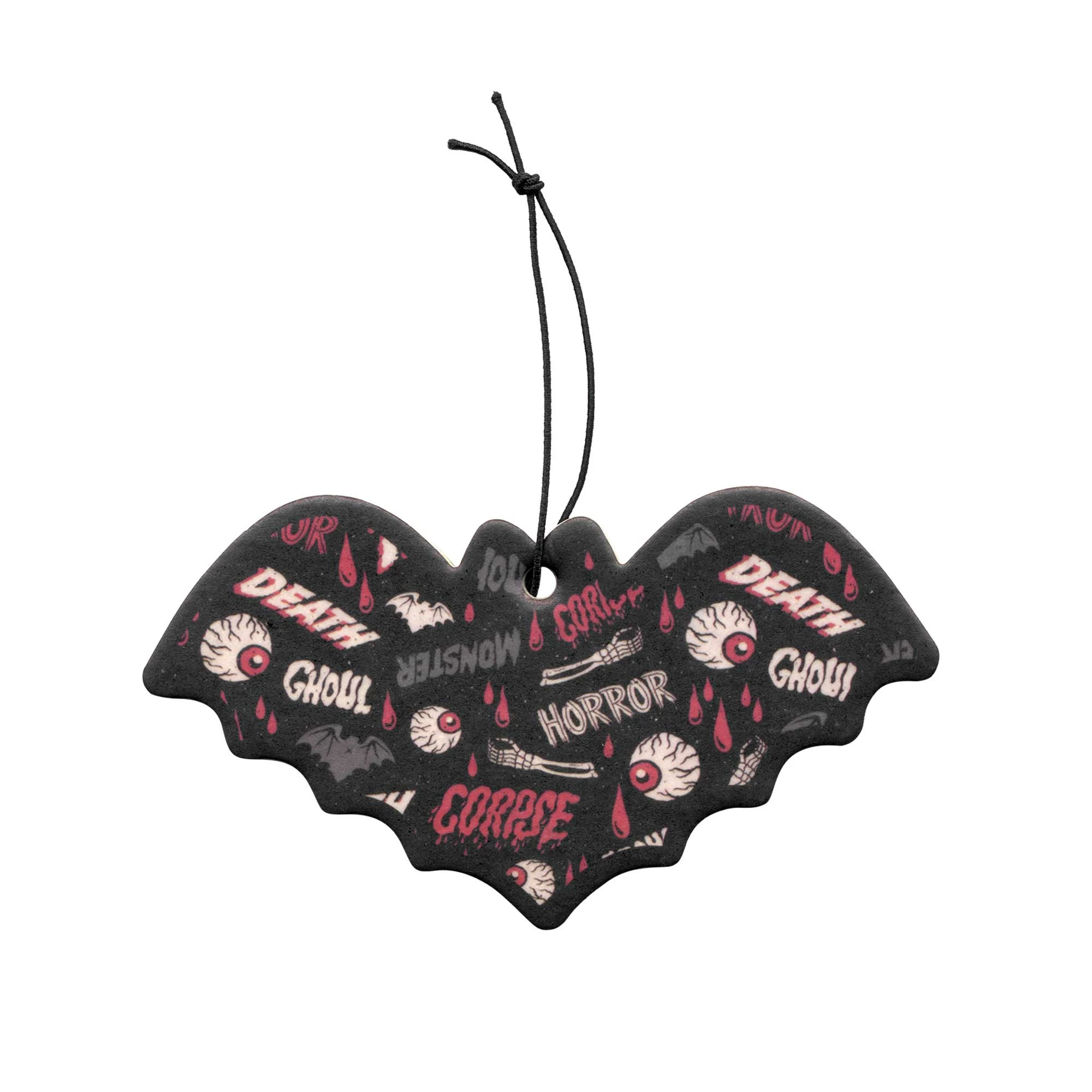 This one is for the glamour ghouls! The Oh the Horror Bat air freshener features a rose scent, a die-cut bat shape printed with eyeballs, blood drippings, bones and much more!